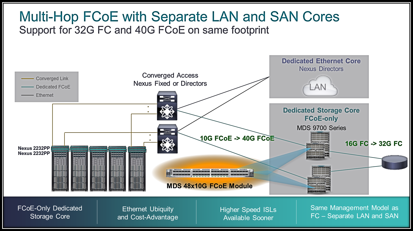 - MDS 9700 allow customers to deploy 10G FCoE solution today and upgrade without forklift upgrade again to 40G FCoE.