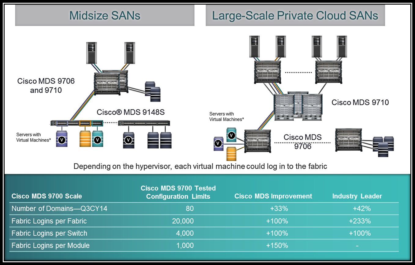 For larger Enterprises scalability has been a challenge due to massive amount of host virtualization. As more and more VMs are logging into the fabric the requirement from the fabric to support higher flogins, Zones. Domains is increasing. MDS 9700 has industries highest scalability numbers as its powered by supervisor that has 4 times the memory and compute capability of the predecessor. This translates to support for higher scalability and at the same time provides room for future growth.