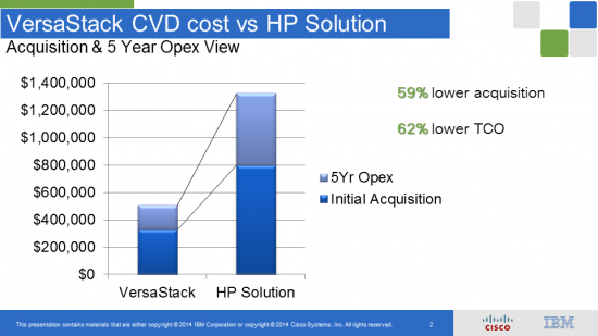 When compared against an all HP solution, VersaStack has 59% lower acquisition cost and a 62% lower TCO over five years.