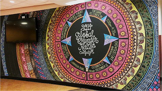 I couldn't be more thrilled that she shares her gift with us! As Cisco employees walk by the wall, Lynne's design both educates and inspires them about the Global Hunger Relief Campaign. Lynne notes, "While I've never had to endure being a 'starving artist,' I've come close a few times and can't imagine parents not being able to feed their children, or someone having to choose between food or medicine or heat." We look forward to Lynne's captivating artwork throughout the year, not only for Global Hunger Relief awareness, but also for our Earth Day celebration.