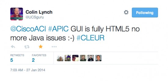 Most importantly, the APIC GUI does not need Java because it is of HTML5! Cisco Champion Colin Lynch @UCSguru showed his happiness about this: