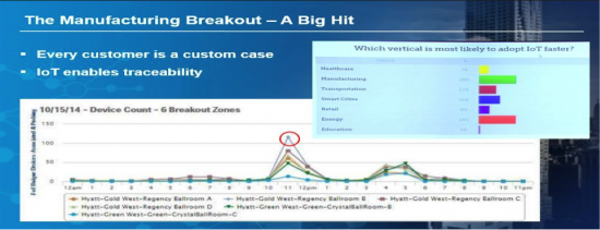 With a simple cross-check, compare it to the polling from the keynote opener the day before: which vertical is most likely to adopt IoT first? Manufacturing takes the lead on both accounts, followed closely by energy, verifying the audience sentiment and how interest translated to behavior at the conference.