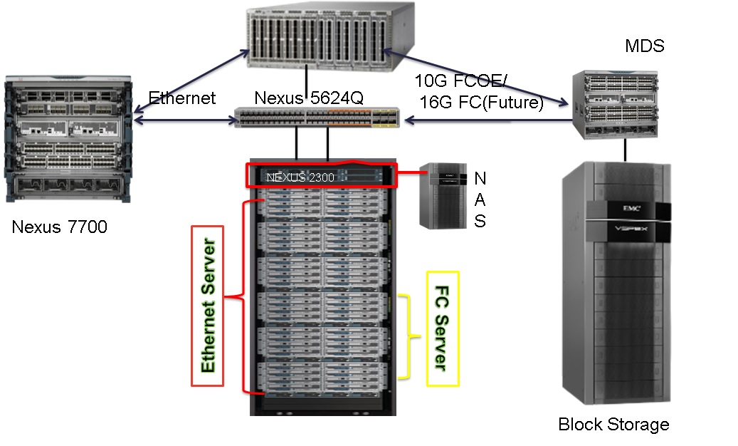 Enterprise storage requirement includes support for both FC and Ethernet based storage protocols (ie FCOE, iSCSI etc). The Nexus 5624Q provides future support for native fibre channel (16G) connectivity to the existing FC SANs in the data center and enables an evolutionary path to the next gen converged architecture. Nexus 5624Q along with Nexus 2200/2300 (FEX) provides the architectural flexibility to scale LAN/SAN convergence and can be deployed in EoR/ToR scenarios.