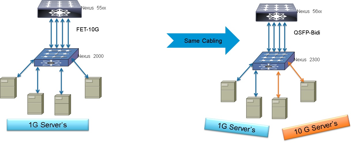 Nexus 2300 in Conjunction with 5600 Series Switch can be used to seamlessly migrate from 1G connectivity to 10G as it supports speed from 100M to 40G. Bidi Optics provides cost saving of upto $4000, as no change of cabling is needed to move from 10G parent to 40G.