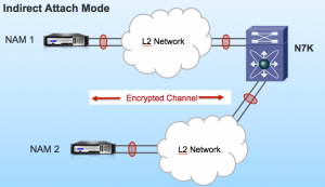 Indirect Attach modes with multiple NAMs: The appliance has a management link that is attached via an L2 network to the Nexus switch. Up to 4 data links on each NAM can be attached to one or more VDCs on the Nexus switch to send SPAN traffic (Figure 4).