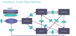 Immediately after establishing a healthy connection, CloudSync runs. CloudSync is a synchronization process driven by a finite state machine whose responsibility is to not only perform initial object discovery and granular fingerprinting -essentially a deep interrogation of cloud objects and their attributes -but also, manage ongoing reconciliation of infrastructure changes with respect to their representation of the provider's cloud infrastructure as modeled within the service catalog. Note the "CloudSync Finite State Machine" chart, which is laced with Extension Points, where cloud administrators may insert custom logic on state transition for any given object within the model. Once collected, this inventory (e.g. a Chef Role) is presented to the cloud administrator for the ACM server for use within their cloud. Cloud administrators may choose to register the discovered objects for use by end users.