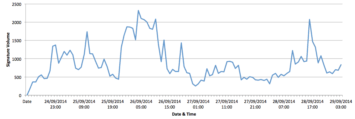 Analysing our IPS telemetry shows that exploitation was detectable as early as Wednesday 24 September 04:00 GMT, reaching a peak on Friday 26 September 04:00 GMT, before tailing off over the weekend and spiking on Sunday 28 September 16:00 GMT. Attempted exploitation of the vulnerability can be expected to continue for many months and years to come.