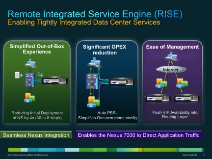 With these requirements and architectures in mind we have a industry first solution called Remote Integrated Service Engine (RISE). RISE is a technology that simplifies provisioning, out of box management of service appliances like load balancers, firewalls, network analysis modules. It makes data center and campus networks dynamic, flexible, easy to configure and maintain.