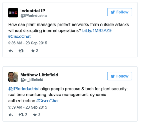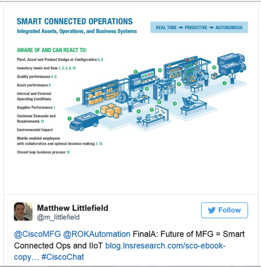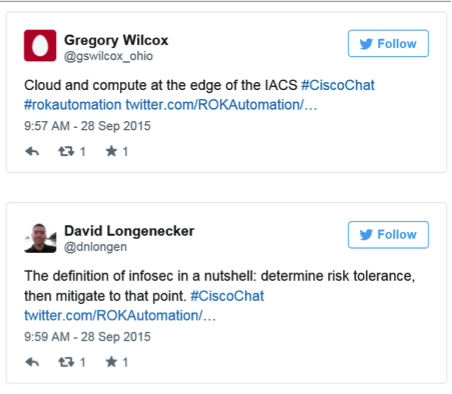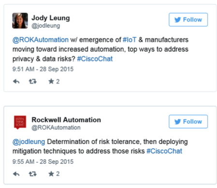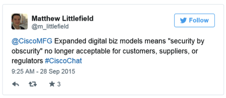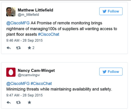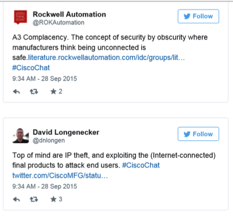 Earlier this week, I hosted a #CiscoChat along with other team members of the @CiscoMFG team including Nancy Cam-Winget (@ncamwingw), an industrial security expert and Distinguished Engineer at Cisco, along with cohost Gregory Wilcox (@gswilcox_ohio) of our strategic alliance partner Rockwell Automation (@ROKAutomation). We had a thought-provoking interchange on how new digital business models impact industrial security interests, as well as some of the other inherent security risks for manufacturers.