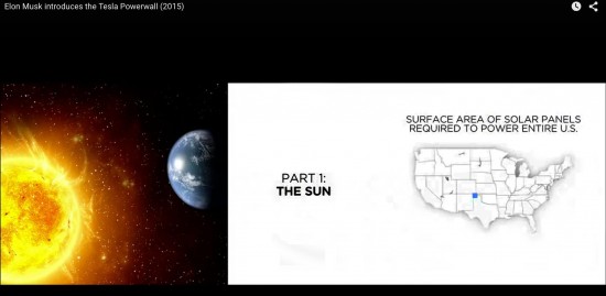 During Elon Musk's presentation of Tesla Powerwall, a battery system that lets you store energy to power your home, he shared a slide showing a small area of the Texas panhandle -with a small blue square representing the land area necessary to produce enough solar power to meet the entire electric power needs of the United States.