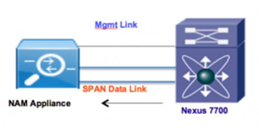 Direct Attach mode with single NAM: The appliance has a management link that is directly attached to the Nexus switch. Up to 4 data links on the NAM can be attached to one or more VDCs on the Nexus switch to send SPAN traffic (Figure 2).