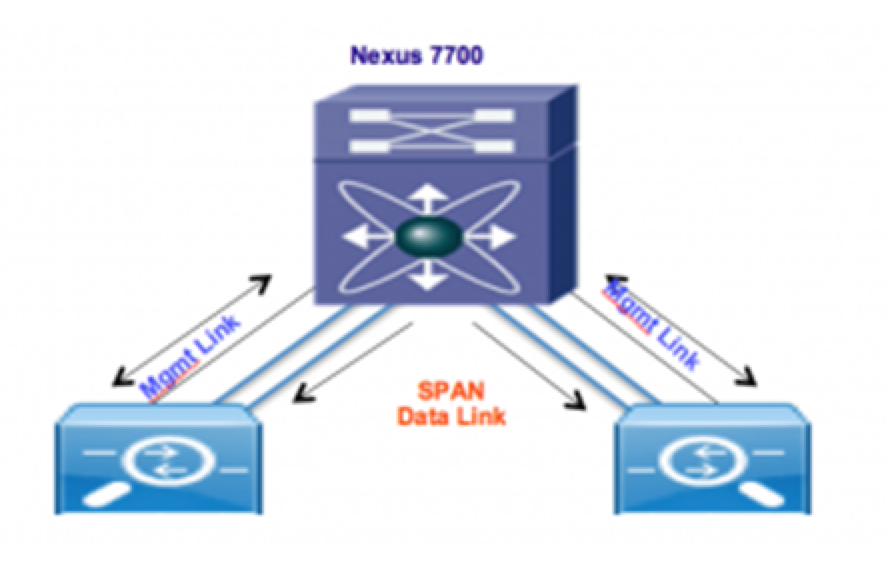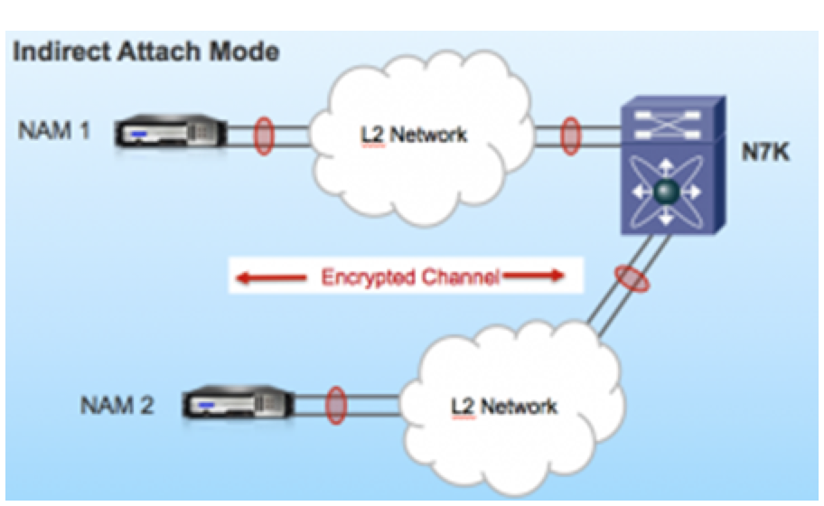 Indirect Attach modes with multiple NAMs: The appliance has a management link that is attached via an L2 network to the Nexus switch. Up to 4 data links on each NAM can be attached to one or more VDCs on the Nexus switch to send SPAN traffic (Figure 4).