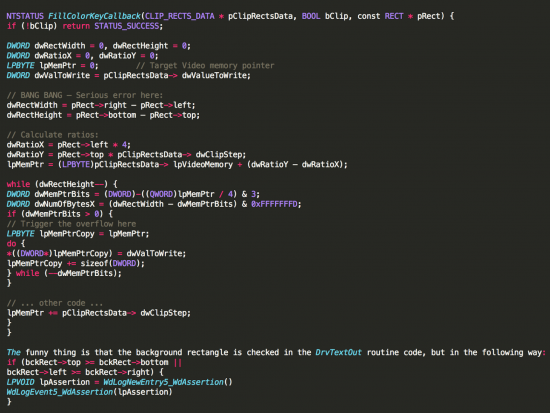 The ClipDstRect routine performs the actual clipping based on the complexity of the Clip object. If the complexity is DC_TRIVIAL, the CPU cache is flushed and the callback routine is called. However, the FillColorKeyCallback routine contains a flaw in that it doesn't properly check the width and height of the rectangle.