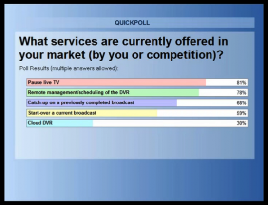 A few years ago, the idea of cloud-based digital video recording (DVR) was an aspiration. Today, while the technology is still relatively new, it's already seeing broad adoption in the market. In a recent webcast conducted with Parks Associates, attendees revealed the breadth of cloud-based services they were already using to catch up on TV content. From basic "pause live TV" features to full cloud DVR, check out the range of cloud services already available: