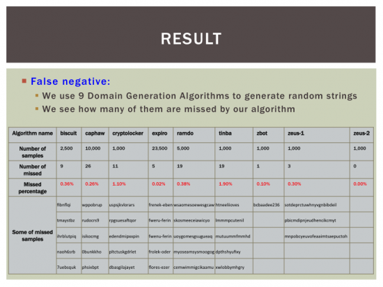 A linear model was built to calculate the randomness score, the weights on the features values as well as thresholds involved in the decision were carefully tuned against legitimate domain names in the Alexa dataset as well as the illegal ones generated by a variety of reverse-engineered DGA. Figure 2 shows the result of the false negative rate on a set of algorithmically generated domains produced by 9 different DGA, together with some of the sample domain names missed by our detection method.