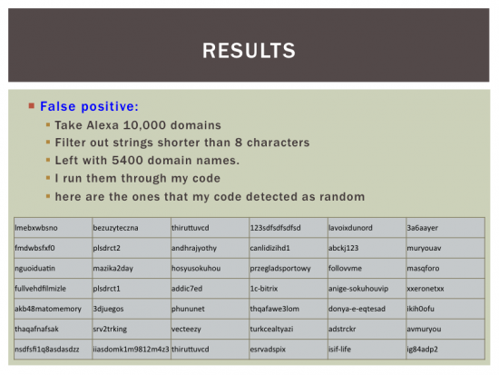 Figure 3 shows the result of running our method on Alexa 10000 domains dataset which is believed to consist of only benign domains. Some of these domain names were considered as randomly generated by our detection method therefore constitute the false positive sample.
