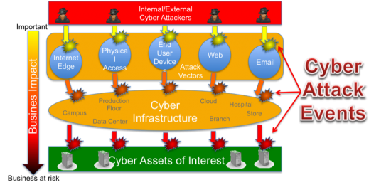 Cyber Attack Events = (Cyber Attackers) * (Attack Vectors * Probability of Being Attacked) * (Infrastructure Assets * Probability of Compromise) * (Assets of Interest * Probability of Successful Attack on Asset)