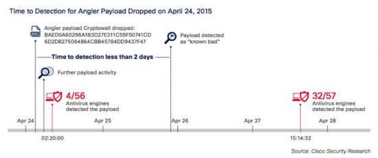 When Angler drops encrypted payloads, such as the ransomware Bedep, they can usually only be identified retrospectively, and time to detection (TTD) can take days, as seen in the chart below from the Cisco 2015 Midyear Security Report: