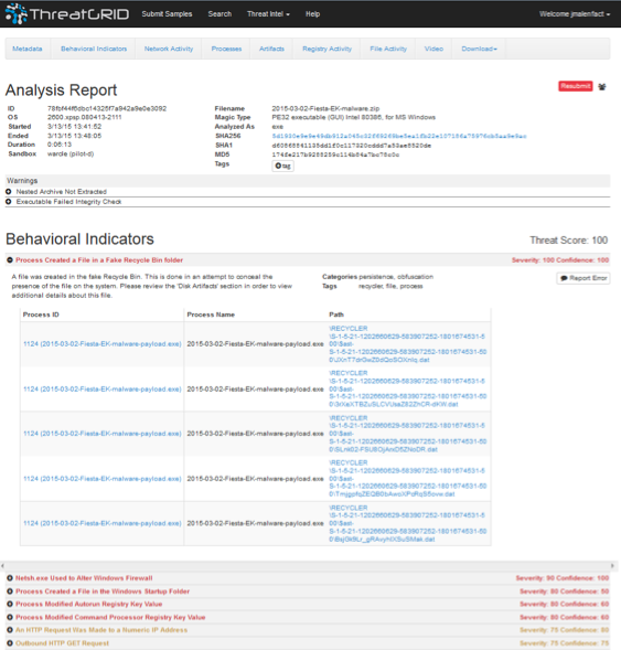 - Proprietary Analysis: Today's malware authors write code to detect if their malware is being analyzed in a virtual environment, some even checking specifically to see if they are in many of the popular open-source sandboxes. If the malware detects it is inside a sandbox, it won't run, rendering the analysis worthless. AMP Threat Grid even looks for this type of behavior: