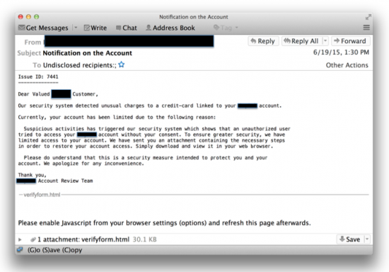 Although many phishing attacks attempt to get the user to open attachments that are designed to load malicious software on the user's system, we have noticed that some attackers have stuck with the basics. Instead of trying to get a user to download or run malicious attachment, these current attackers are simply attaching an HTML document to their phishing emails or including the HTML instructions in the body of the email itself. The following shows the a sample of the realistic phishing attempts that these attackers can generate to trick users into revealing their sensitive information.