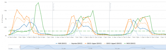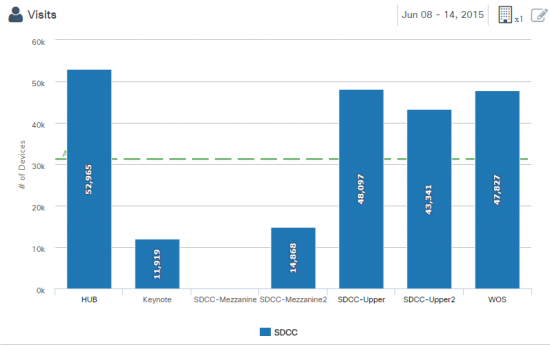 - John Chambers keynote was very popular -the Keynote area (the light blue line) shows a massive spike during the keynote peaking at more than 5000 unique devices