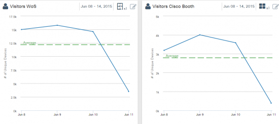 Another interesting question is how many people came to the Cisco booth in the World of Solutions. Looking at the data we can see that on average around 25% of the visitors to the WoS came to the Cisco Booth. Should be noted that to get more accurate data we are filtering out visitors that spent less than 20 minutes in the Cisco Booth ('walking through') as well as devices that were seen for more than 4 hours (which we assume are the booth staff).