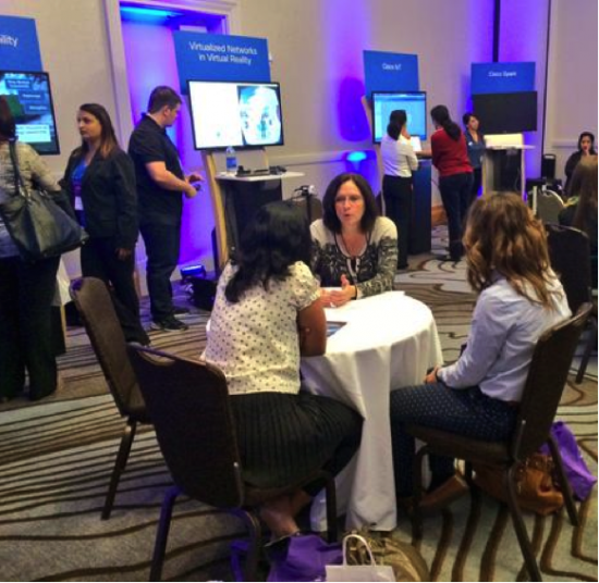 Rebecca Jacoby, Senior Vice President of Operations at Cisco, speaks with attendees about career development at Cisco's Innovation Cafe during the conference.