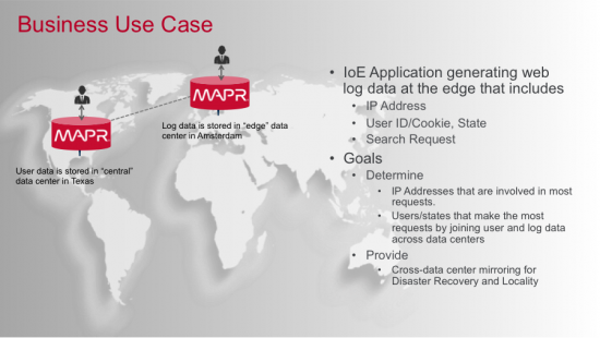 With the ability to place the user Volume on the Texas Toplogy, and the log Volume on the Amsterdam Topology, it's trivial to keep the data local. And if Disaster Recovery is required, MapR Local Mirrors makes it easy to replicate the data from one data center to another for continued data access in case of an outage. Using Apache Drill, a user can simply run an SQL Statement that joins the log data from Amsterdam and the user data from Texas without the need to collocate the data in the same data center, providing a truly distributed platform.