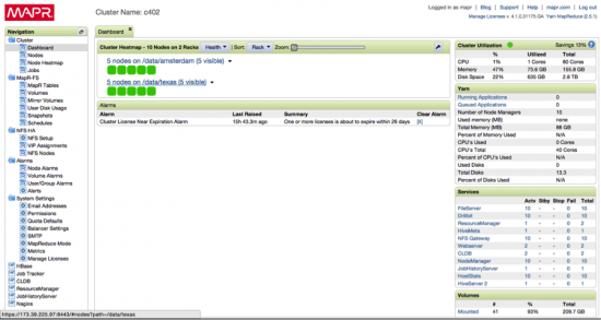 As you can see below in the MapR Control System, both of these Toplogies appear as one cluster in which five servers reside in Amsterdam and five nodes reside in Texas, but still act as one unified cluster.