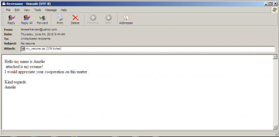 The use of resume based SPAM isn't anything new. An analysis of our telemetry has found countless messages in the last 30 days related to Resumes. Threat actors have tried many different techniques associated with these messages including using password protected zip files, word documents with embedded macros, and malicious URLs redirecting back to a malicious sample. This threat combined a series of techniques to try and avoid detection that has been surprisingly successful against some products. Below is a sample of one of the emails that we saw in our telemetry.