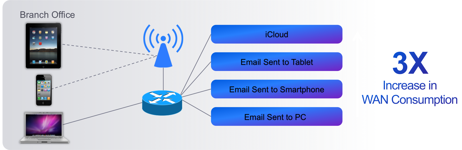 What are the impacts? VDI and cloud applications rely heavily on the WAN for speed. A simple email now sends to three different devices: laptop, tablet, and smartphone, consuming 3x the bandwidth (see Figure 2). Yet bandwidth is finite so latency is inevitable. Distance and geography further exacerbates latency resulting in jitter and packet loss. Application performance degradation amplified as the branch takes on these transitions: virtualization, cloud, and the proliferation of devices (BYOD).