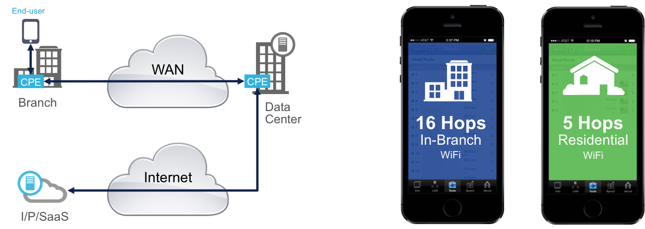 In addition to the above, traditional network architecture that backhauls access to the data center isn't designed for speed. Typical application access takes 16 hops on in-branch Wi-Fi and 5 hops if on residential Wi-Fi (see Figure 3). Each hop adds delays, which lengthens latency.