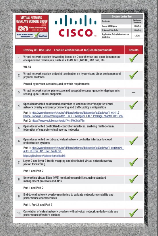 Cisco ACI was a highlight this week at ONUG. ONUG published the first set of results from its Vendor Feature Verification Testing and Cisco Application Centric Infrastructure participated. We passed all the applicable top ten vendor use cases to be a verified vendor of the ONUG Virtual Network Overlays Working Group. If you look across the ten criteria identified by the ONUG working group, you see a number of places where ACI stands out from alternatives in the market.