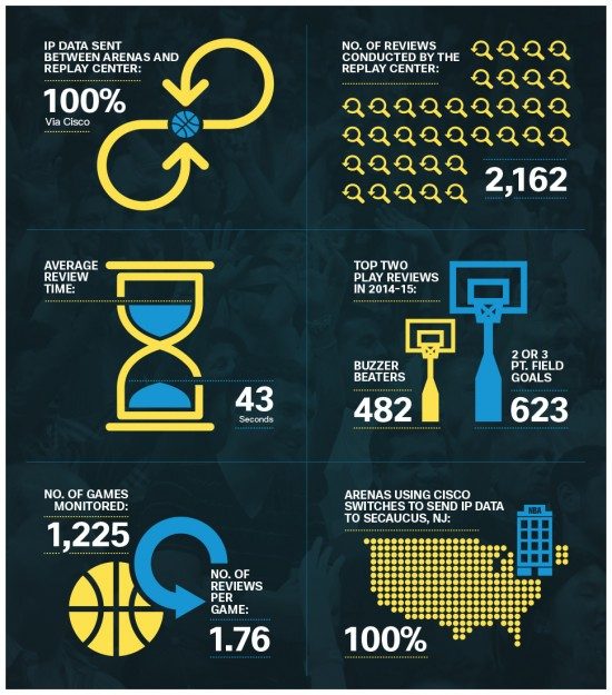 It is precisely these moments where Cisco and the NBA Replay Center come into play. Instantly, HD footage and IP data are sent from the arena to the NBA's state of the art replay facility where it is reviewed, clipped and sent back to the refs at courtside. That footage now arrives in real-time, meaning more time for the game to flow, and less bitten nails on the fingers of the fans.