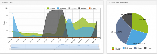- Dwell Time Distribution displays the duration of visitors' time in the venue.