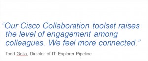 But just don't take my word for it. Recently, I spoke with Explorer Pipeline executives about how they are using Cisco Collaboration solutions to attract, train and engage a diverse workforce of more than 350 employees, spread along the company's 1,800+ mile-long pipeline. They are increasing employee participation and collaboration, and turning company communications into a two-way dialogue using high-definition video.