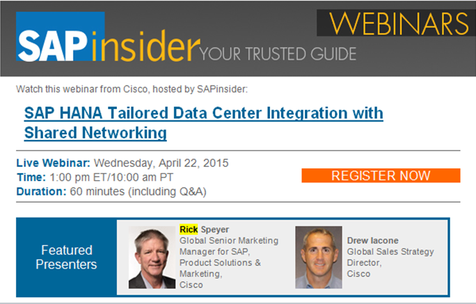 4. If you cannot make the webinars but are attending SAP Sapphire in Orlando May5-7, you can also drop by the Cisco booth #330 and talk with Cisco specialists about this solution and the many other solutions that Cisco has for SAP applications.