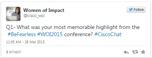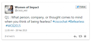 Following the Women in Impact Conference, the team hosted a second "Be Fearless" #CiscoChat to discuss highlights from the conference and how women can remain fearless while pursuing career passions. Chat participants shared their real-life solutions, from paying closer attention to personal health to the reliable practice of just trusting their instincts. See the full #CiscoChat recap on Storify.