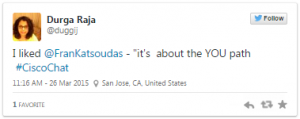 Hosted by the Cisco Collaboration team live from the SXSW Interactive Festival, this #CiscoChat asked conference attendees how they work to increase productivity and disrupt traditional collaboration methods for real-time flexibility on the go in advance of the announcement around our new collaboration service, Cisco Spark. We also leveraged innovative new social platforms, such as Meerkat, to extend the conversation. #CiscoChat broke through the sheer amount of online buzz during SXSW, trending locally in Austin on Twitter during the event. See the full #CiscoChat recap on Storify.