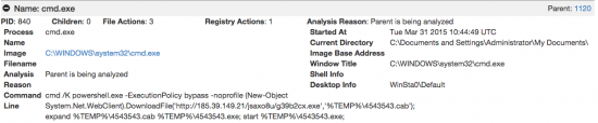 Behind the scenes a macro was using cmd.exe, leveraging powershell, to download and execute a malicious executable from a hard coded IP address.