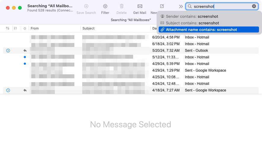 If you choose Mail or Messages for your screenshots, you can use the search tool in each of these apps. For example, if you retained the default file name, you can search with the below options.
