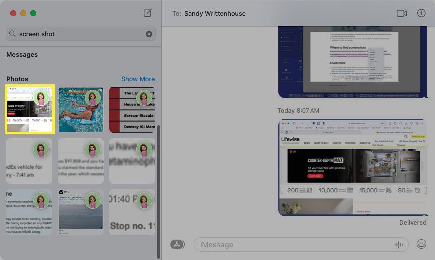 In Messages, enter "screen shot" in the Search box on the left and then move down to Photos to find the image. Double-click the screenshot and you'll see it display in the corresponding text message conversation.