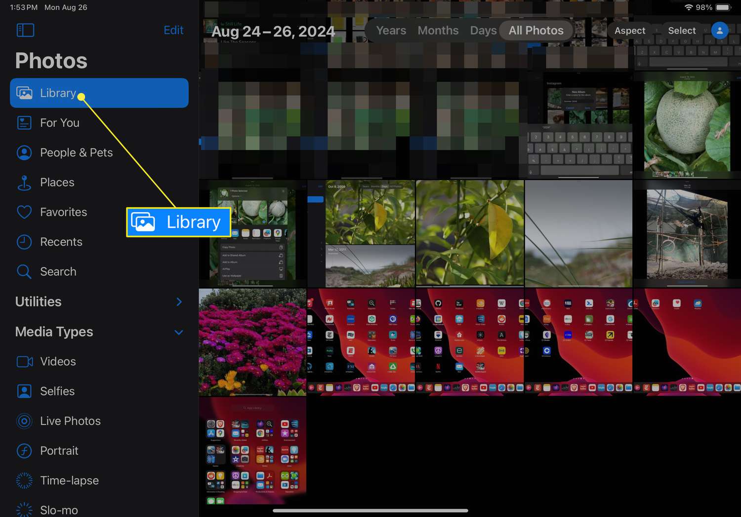 Tap Library from the left sidebar in the Photos app.