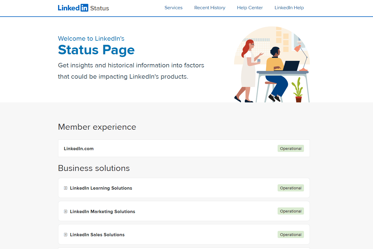 - Visit LinkedIn's Status Page. This makes it clear whether the service is operational or not, and it's fairly trustworthy since it's not hosted on the company's main website.