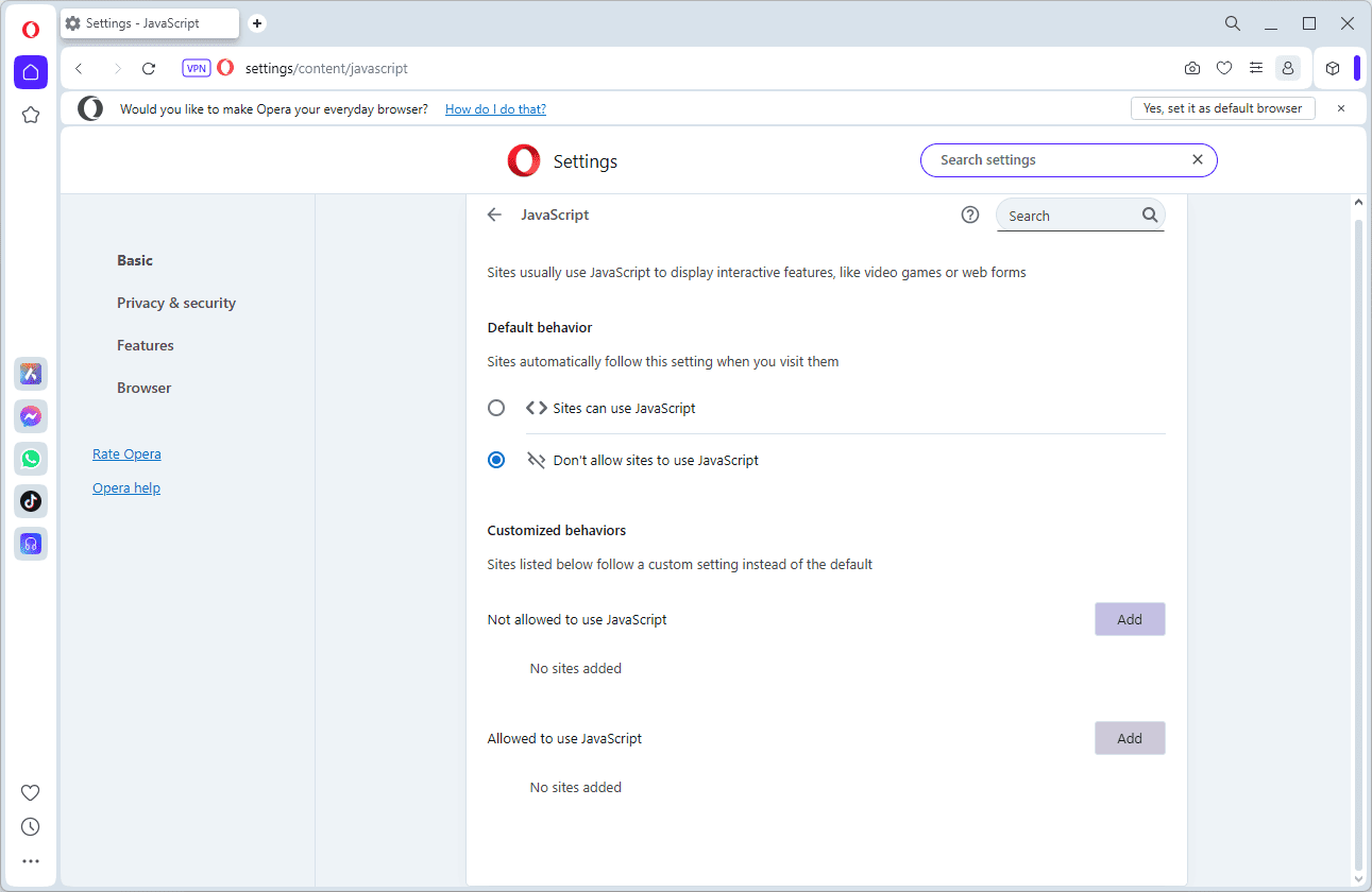 Opera has two settings related to JavaScript. Follow these steps to disable JavaScript across all sites or pick specific websites that aren't allowed to use it.