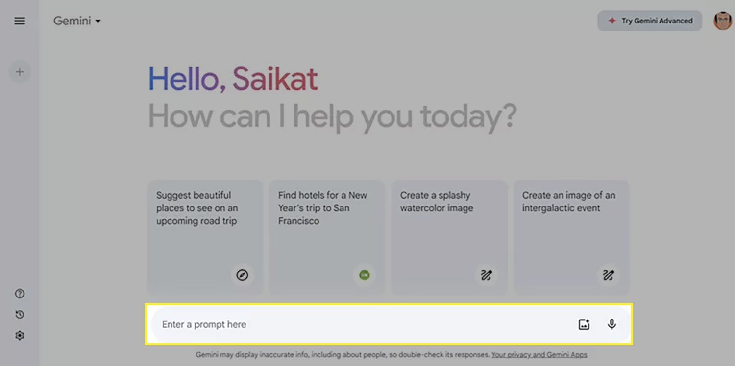 1. In the Gemini chat window, begin typing your request in the Enter your prompt here field.