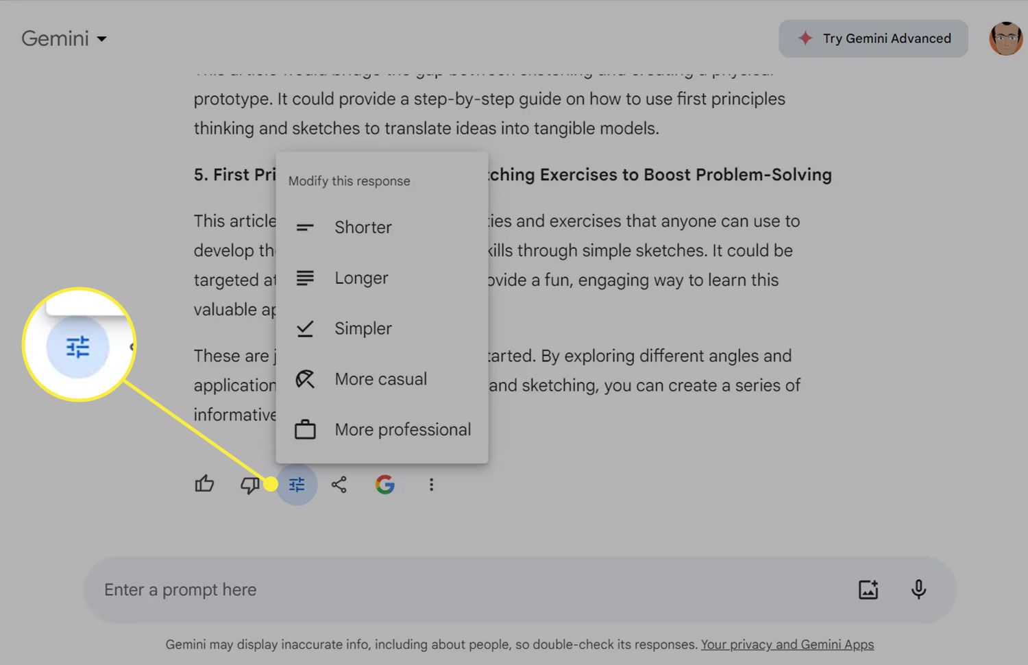 You don't have to accept Gemini's original answer. The generative AI chatbot offers a few extra methods to change the style of the answer.