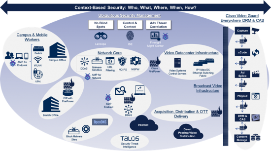 Cisco's Threat-Centric Security Solutions for the Media Industry are designed to protect your video content and broadcast infrastructure so you can focus on developing compelling content that can be delivered securely to your viewing audience. With Cisco, you are protected by the #1 in data center security and the #1 in video security. Our multilayered solutions work together to ensure that your content, services and business are protected from advanced cyber threats -across the attack continuum -before, during and after an attack. BEFORE the attack, our solution strengthens the network perimeter, enforces secure access, and safeguards media content across networks, systems, users, and data. DURING the attack, it provides real-time detection and mitigation from known threats. And AFTER the attack, it helps you to quickly discover malware that gets in and resolves these unknown attacks to prevent your business from being compromised.