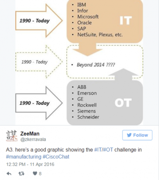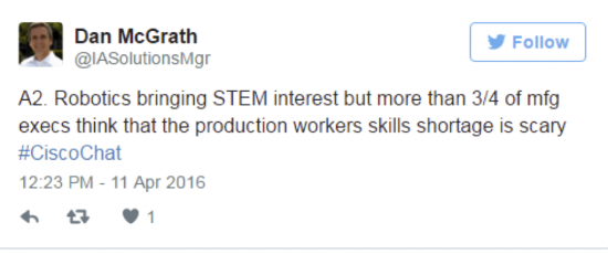 To address these challenges, I hosted a #CiscoChat this week with Paul Taylor, Strategic Alliance Manager at Cisco, Dan McGrath, Senior Business Development Manager at Panduit, and Jeff Gao, Corporate Director at Cisco. We discussed workforce challenges such as the IT/OT knowledge gap as well as how to attract and prepare workers for the changing industry landscape.