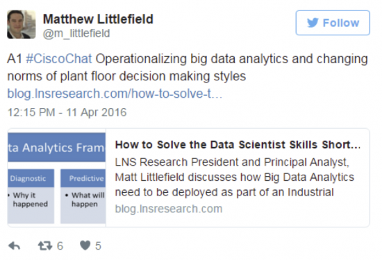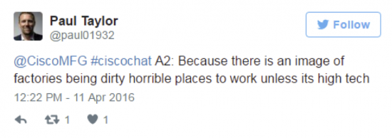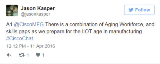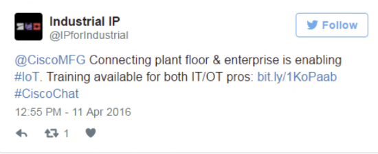 If you didn't have a chance to attend the #CiscoChat, you can get a full recap of the questions and responses by reading our Storify. We will have more discussions in the future, so be sure to follow the @CiscoMFG team and keep up with the conversation using the hashtag #CiscoChat.